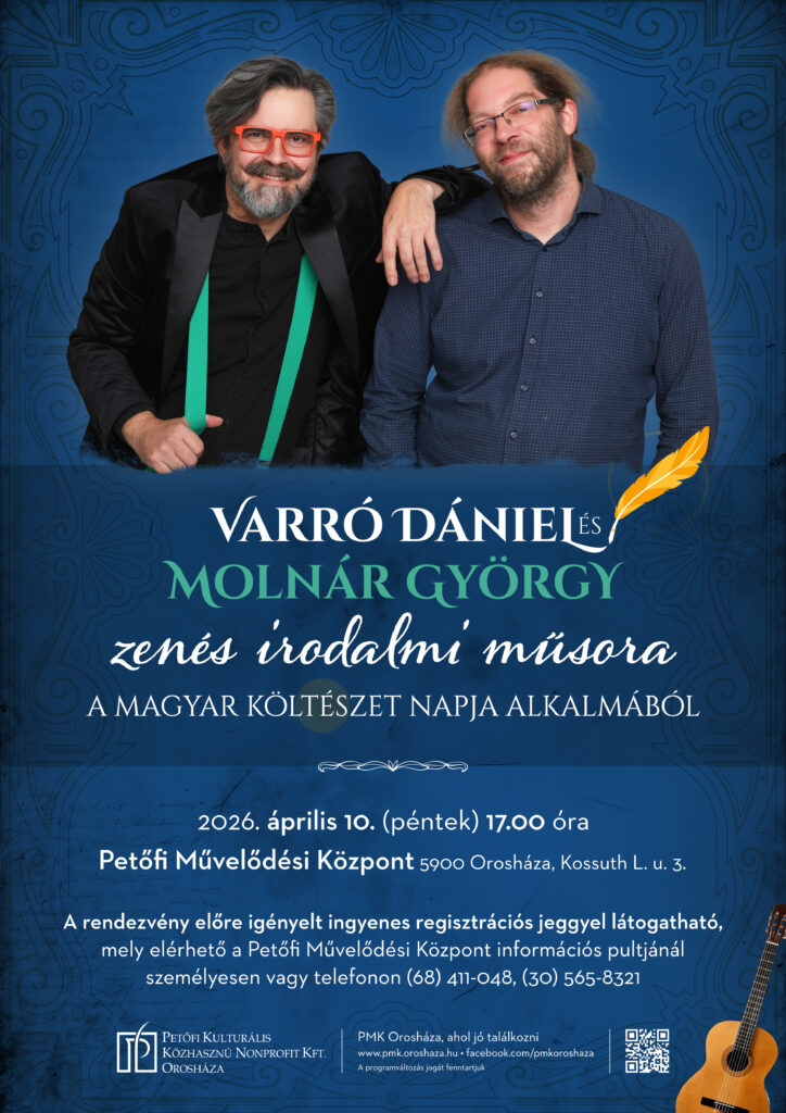 Varró Dániel és Molnár György zenés irodalmi műsora a magyar költészet napja alkalmából Orosházán, a Petőfi Művelődési Központban