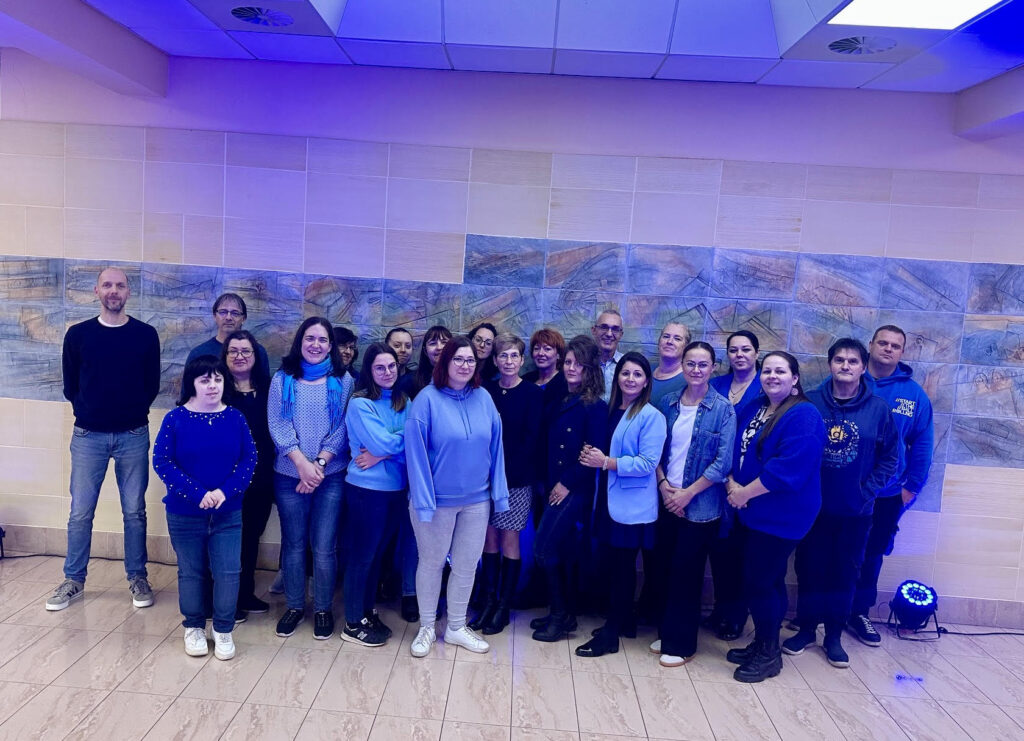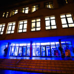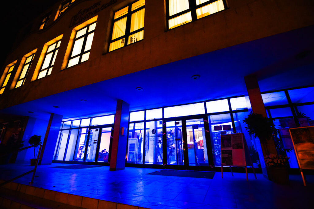 Kékbe öltözött valamennyi kollégánk november 20-án és a hagyományoknak megfelelően kék megvilágítást kapott intézményünk is, ezúttal már nem csak a főbejárat, az Árpád-kert felőli színháztermi előcsarnokunk is figyelemfelhívó színt öltött.