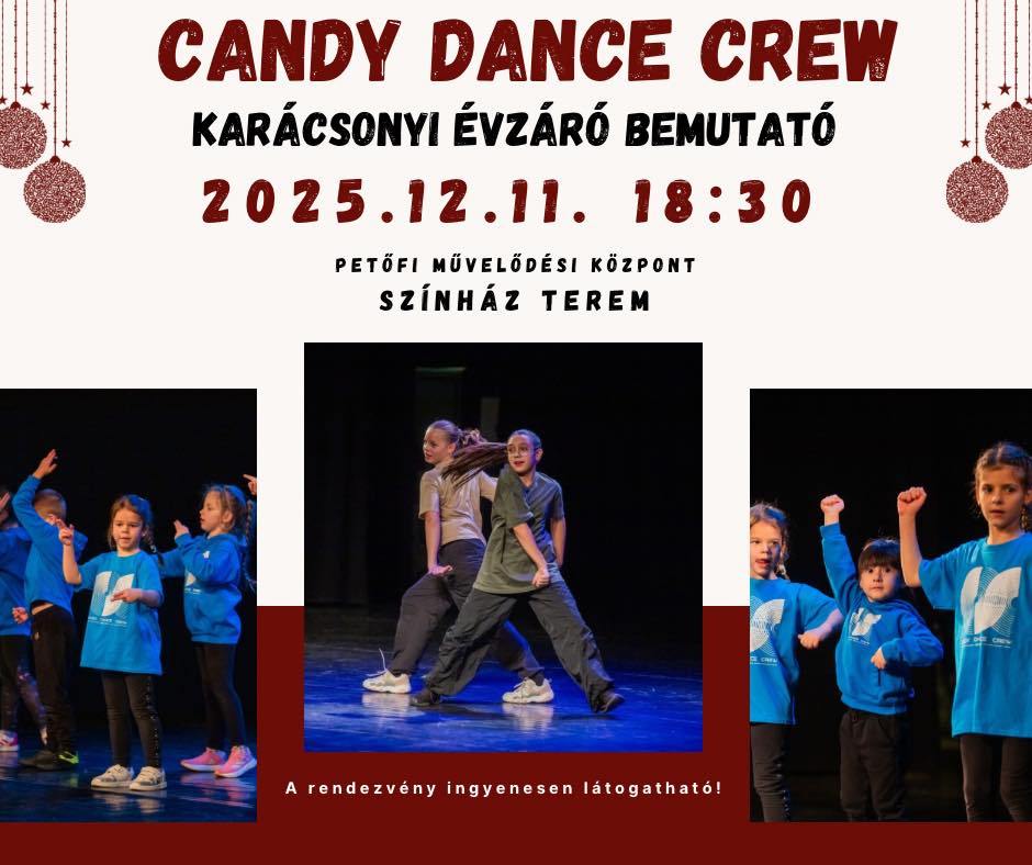 A Candy Dance Crew karácsonyi évzáró bemutatója 2025. december 11-én, csütörtökön 18.30 órától Orosházán, a Petőfi Művelődési Központban. A belépés ingyenes.