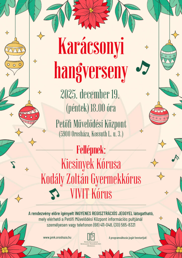Karácsonyi kórushangverseny 2025. december 19-én, pénteken 18 órától Orosházán, a Petőfi Művelődési Központban. Fellépnek: Kicsinyek Kórusa, Kodály Zoltán Gyermekkórus, VIVIT Kórus.