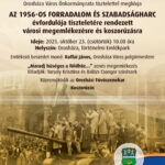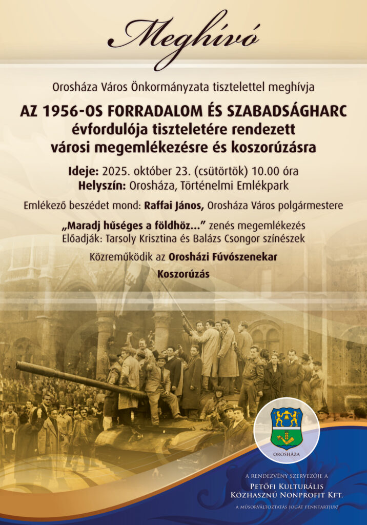 Orosháza Város Önkormányzata tisztelettel meghívja az 1956-os forradalom és szabadságharc évfordulója tiszteletére rendezett városi megemlékezésre és koszorúzásra 2025. október 23-án, 10 órától Orosházán, a Történelmi emlékparkban.