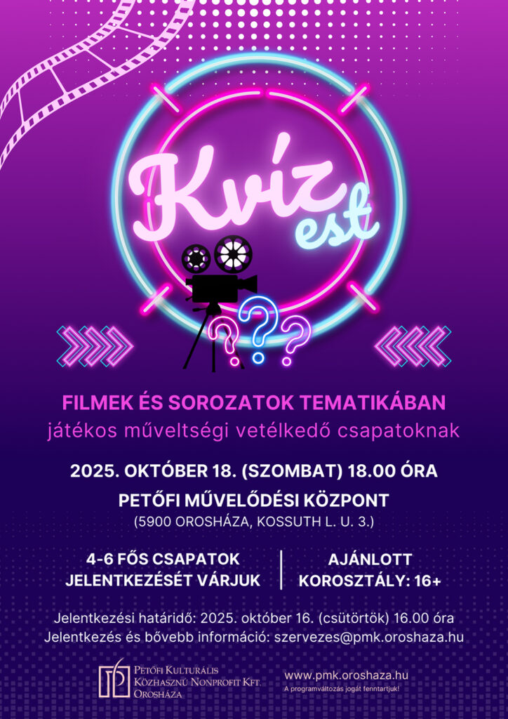 Ismét meghirdetjük a kvízestet, ezúttal a filmek lesznek a középpontban 2025. október 18-án, szombaton 18 órától Orosházán, a Petőfi Művelődési Központban. Családi, baráti, munkahelyi csapatok jelentkezését várjuk, részletek ide kattintva.