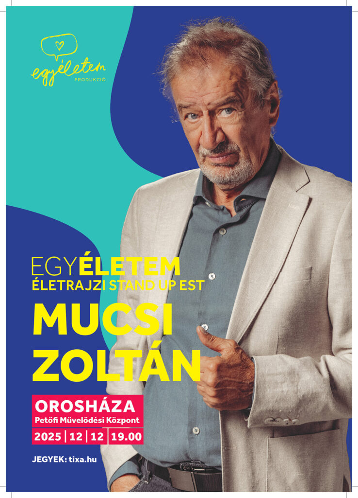Egy életem – életrajzi stand up est Mucsi Zoltánnal 2025. december 12-én, 19 órától Orosházán, a Petőfi Művelődési Központban.